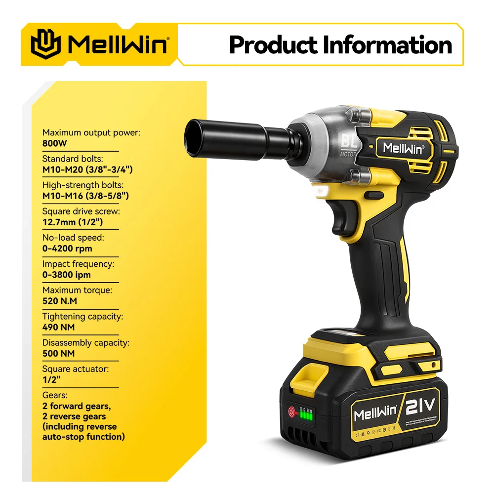 【800W Brushless Motor】 Equipped with a brushless motor, it delivers powerful and stable output while consuming less energy, dissipating heat faster, and offering extended service life. Featuring 0-4200 rpm no-load speed and 0-3800 ipm high-impact frequency, paired with 520N·m peak torque, it delivers 490N·m tightening capacity and 500N·m loosening capacity. Whether tackling stubborn rusted bolts or meeting high-standard fastening requirements, it handles it all with a single press, doubling your efficiency.